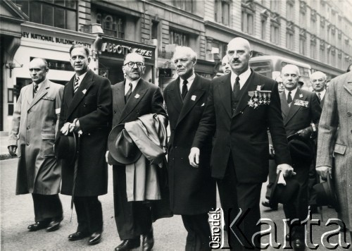 Demonstracja zorganizowana przez Polonię przeciwko planowanej wizycie w Polsce I sekretarza Komitetu Centralnego Komunistycznej Partii Związku Radzieckiego (KPZR) Nikity Chruszczowa, a także premiera ZSRR Nikołaja Bułganina. Na pierwszym planie członek Rady Trzech gen. Władysław Anders podczas rozmowy (z lewej).