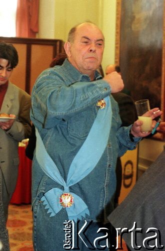 Uroczystość dekoracji Jacka Kuronia Orderem Orła Białego. J. Kuroń odbiera gratulacje od Adama Michnika.