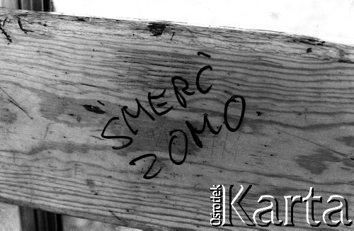 Stan wojenny, napisy i hasła popierające podziemną Solidarność. N/z napis na ścianie budynku "WRON precz".