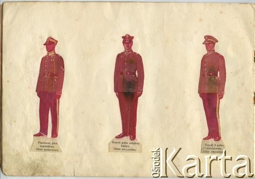 Mundury Wosjka Polskiego. Od lewej: starszy szeregowiec pułku radiotelegraficznego w ubiorze polowym, plutonowy piechoty w ubiorze polowym oraz saper w ubiorze polowym.