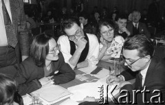 26-27.01.1991, Warszawa, Polska. I Krajowy Zjazd Ruchu Obywatelskiego - Akcja Demokratyczna (ROAD), stoi Włodzimierz Mękarski, pochylony Paweł Kocięba-Żabski, 1. z prawej Wiesław Mielcarski. Fot. Mieczysław Michalak, zbiory Ośrodka KARTA