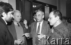 26-27.01.1991, Warszawa, Polska. I Krajowy Zjazd Ruchu Obywatelskiego - Akcja Demokratyczna (ROAD). Przerwa w obradach, od lewej: Władysław Frasyniuk, Andrzej Wielowieyski, Tadeusz Mazowiecki, NN. Fot. Mieczysław Michalak, zbiory Ośrodka KARTA
