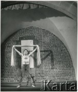 1971, Warszawa, Polska. Spektakl „Na dnie" (według dramatu Maksima Gorkiego) w reżyserii Jana Maciejowskiego w Teatrze Narodowym. Na scenie stoi Lech Ordon. Fot. Romuald Broniarek, zbiory Ośrodka KARTA