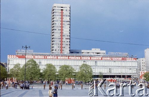 Święto Odrodzenia Polski (22 Lipca), na zdjęciu dekoracje i hasła propagandowe na Domu Towarowym Junior przy placu Defilad.