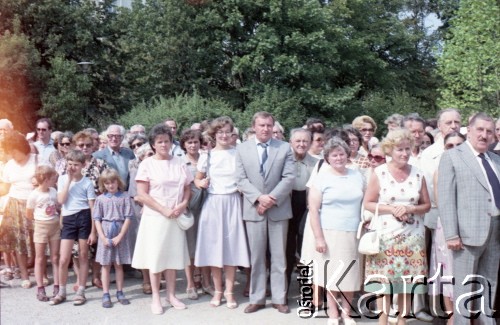 Uroczystości związane z odsłonięciem pomnika Ignacego Jana Paderewskiego w nowym miejscu - w Parku Ujazdowskim. Odlana z brązu rzeźba projektu Michała Kamieńskiego od 1978 ustawiona była przy ul. Okólnik, w sąsiedztwie Pałacu Ostrogskich i Państwowej Wyższej Szkoły Muzycznej. W 1985 roku pomnik przeniesiono i ustawionio w nowej lokalizacji, naprzecikwo wejścia do Parku Ujazdowskiego. Na zdjęciu uczestnicy uroczystości składają wieniec pod pomnikiem.