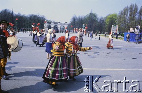 Pochód pierwszomajowy na placu Zwycięstwa (obecnie plac Piłsudskiego), na zdjęciu członkinie zespołu ludowego w pochodzie pierwszomajowym. W głębi Grób Nieznanego Żołnierza.