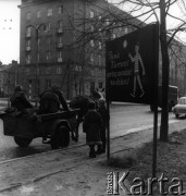 23.11.1962, Warszawa, Polska. Dwie osoby jadące konnym wózkiem po ulicy. Obok tablica z ...