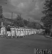 Maj 1956, Warszawa, Polska. Kolumna pielęgniarek idzie ulicą. Fot. Romuald Broniarek, ...