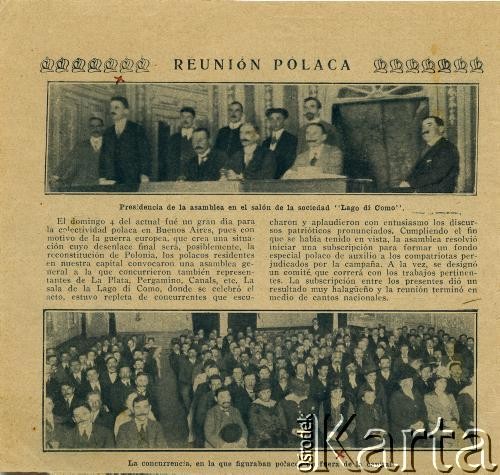 Ogłoszenie dotyczące Ogólnego Wiecu Polskiego zorganizowanego przez działaczy polonijnych po wybuchu I wojny światowej. Organizatorzy deklarują: „Wiedzeni poczuciem obowiązku względem Ojczyzny i miłości ku Niej, postanowiliśmy i tu, w Argentynie, rozpocząć akcyę narodową i wzywamy wszystkich rodaków, aby nas poparli. Zaś w celu wzajemnego poznania się, zbliżenia i wreszcie obliczenia sił naszych urządzamy Ogólny Wiec Polski, na który wszyscy powinni przybyć”.