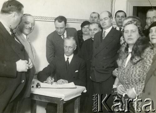 Marsza3ek Senatu RP W3adys3aw Raczkiewicz sk3ada podpis w „Z3otej Ksiedze” w siedzibie polskiego stowarzyszenia „Ognisko Polskie”. Za nim stoj1 pose3 RP w Buenos Aires W3adys3aw Mazurkiewicz i ks. W3adys3aw Zakrzewski.