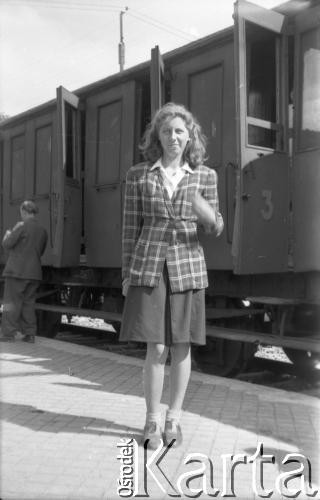 W oczekiwaniu na pociąg na peronie. Wśród pasażerów żołnierze francuscy i Maria Świeczewska. Fotografia wykonana przez męża Marii - Karola. Oboje po wojnie wyemigrowali do Argentyny. Małżeństwo przyjaźniło się z pisarzem Witoldem Gombrowiczem.