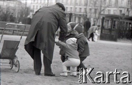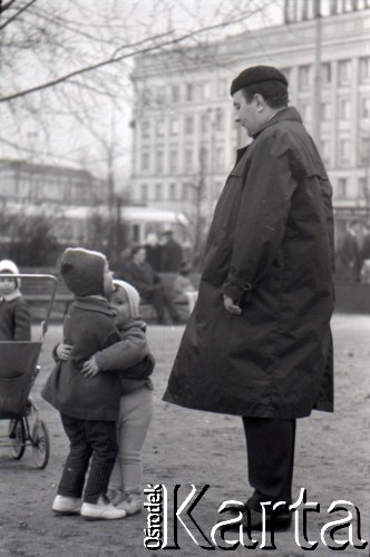 Ojciec z dziećmi na placu Komuny Paryskiej (obecnie plac Wilsona), w głębi kino Wisła.