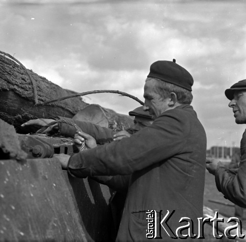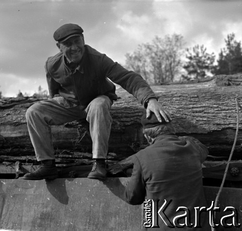Zrzucanie pni drzew (dłużycy) z wagonu.