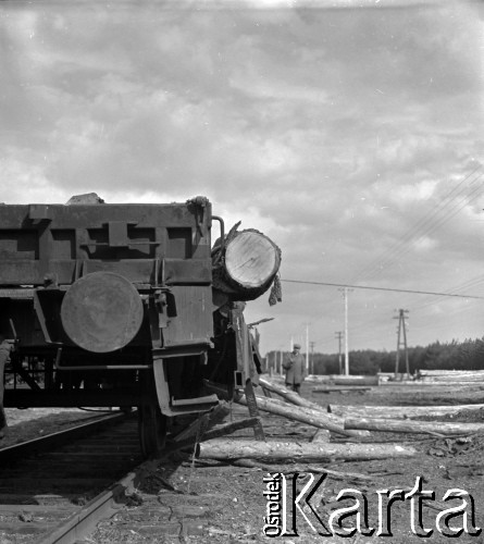 Zrzucanie pni drzew (dłużycy) z wagonu.