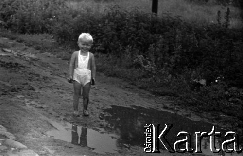 Dzieci wiejskie podczas zabawy na błotnistej drodze.