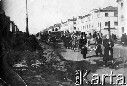 Pogrzeb Mariana Szczepańskiego zmarłego po zwolnieniu z łagru. Kondukt na ulicy miasta, krzyż niesie Antoni Raubo.