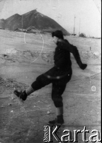 Stanisław Kiałka po zwolnieniu z łagru. Mężczyzna w czapce-uszance jeździ na łyżwach. W tle hałda kopalni 9-10.