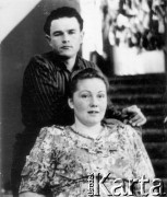 1956, Sanok, Polska. Punkt repatriacyjny w Sanoku, stoją od lewej: Jan Łopaciński, Halina ...