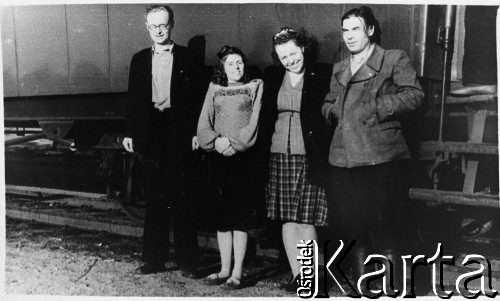 Polacy zwolnieni z łagrów podczas podróży do kraju. Od lewej: Henryk Meszczyński, NN, Irena (nazwisko nieznane), Ćwikła.