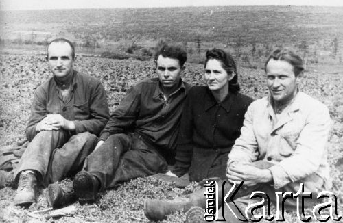 Zesłańcy, siedzą od lewej: Antoni Zierałko (ksiądz), Bolesław Waluk, Wanda Zajączkowska, Stanisław Szwed.