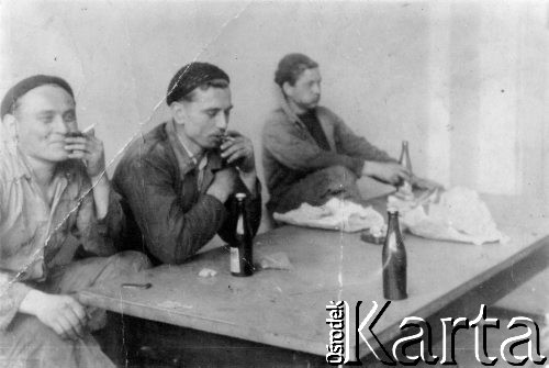 Więźniowie przy kopalni Rudnik-Dżezkazgan siedzą przy stole. Od lewej: NN (Litwin), Tadeusz Biały, NN (Grek).