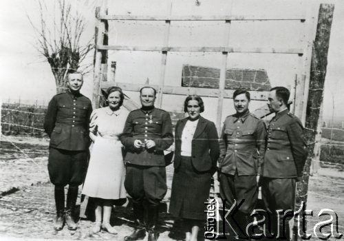 Polscy oficerowie w obozie internowania, mężczyźni w mundurach i dwie kobiety stoją na ganku domu.