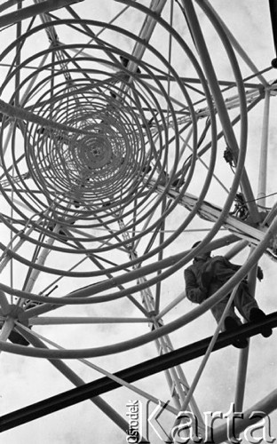 Prace przygotowawcze na terenie Targów Poznańskich na osiemnaście dni przed otwarciem imprezy, robotnicy montują stalową konstrukcję.