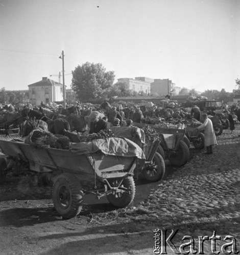 Handlarze na targowisku, kobieta na wozie z rabarbarem i cebulą.