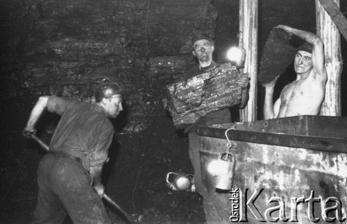 Kopalnia Węgla Kamiennego "Jowisz", dwaj górnicy sprawdzają stemple w korytarzu.