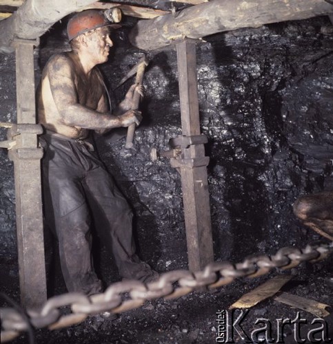 Kopalnia Węgla Kamiennego "Makoszowy", dwaj górnicy pracujący pod ziemią.