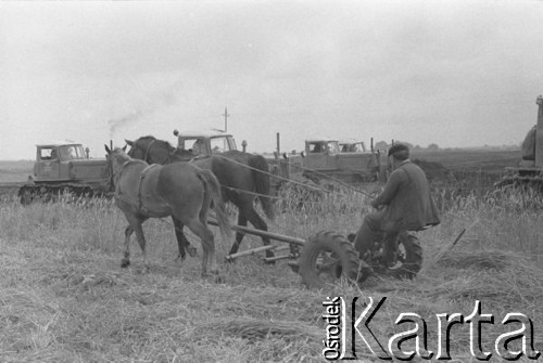Spychacz, koparka i samochody ciężarowe na budowie szerokotorowej Magistrali Hutniczo-Siarkowej.