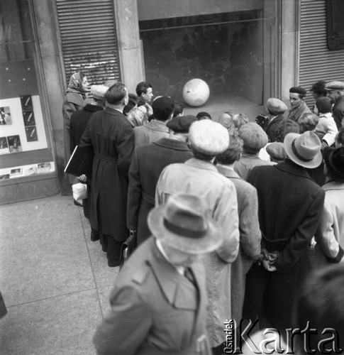 Warszawiacy ogladają makietę pierwszego radzieckiego sputnika na wystawie Klubu Międzynarodowej Prasy i Książki.