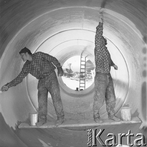 Budowa Huty Katowice, na pierwszym planie mężczyzna podlewający trawnik, w tle tablica z hasłem: "Budowlani - hutnikom. Zrobimy więcej niż to wynika z naszych obowiązków".