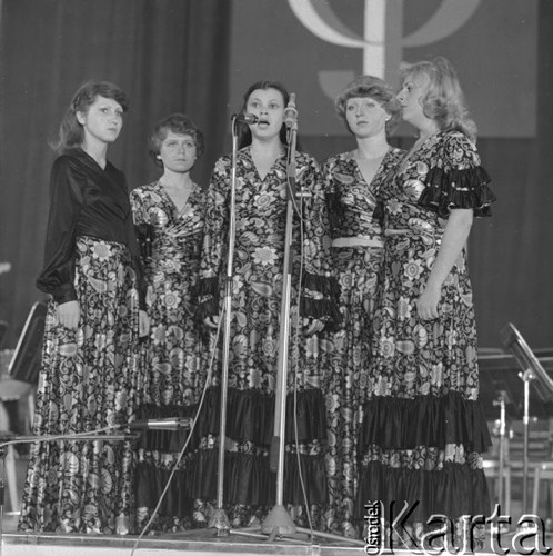 Ogólnopolski przegląd chórów i zespołów wykonujących pieśni rosyjskie i polskie pt. "Przyjaźń w pieśni", dziewczyny stojące obok plakatu konkursu.