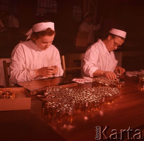 Pracownice Fabryki Kosmetyków "Pollena-Uroda" pakują buteleczki z perfumami.