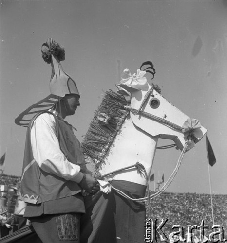 Dożynki na Stadionie Dziesięciolecia, dwaj harcerze stoją przed trybuną honorową, na której siedzą m.in. Władysław Gomułka i Józef Cyrankiewicz.