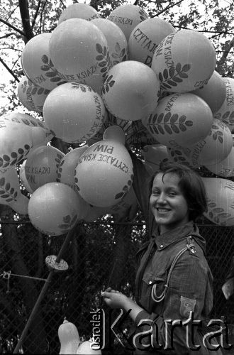 XII kiermasz książki. Harcerka z balonami reklamowymi z napisem: "Czytajcie książki P.I.W."