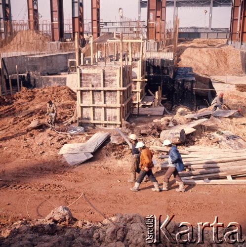 Budowa Huty Katowice, fragment placu budowy, z prawej trzej robotnicy w odzieży ochronnej i kaskach.