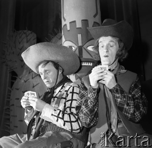 Przedstawienie "Jim strzela pierwszy" na deskach Teatru Syrena, z lewej siedzi Kazimierz Brusikiewicz - Grimpo, z prawej Wacław Jankowski - Dakota Kid.