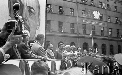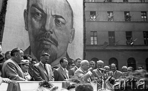 Obchody piętnastolecia PRL. Na trybunie stoją m.in: Nikita Chruszczow, Edward Gierek i Władysław Gomułka, w tle wisi portret Włodzimierza Lenina. Na ścienie budynku z prawej wisi transparent: "Niech żyje wieczysta przyjaźń polsko-radziecka".