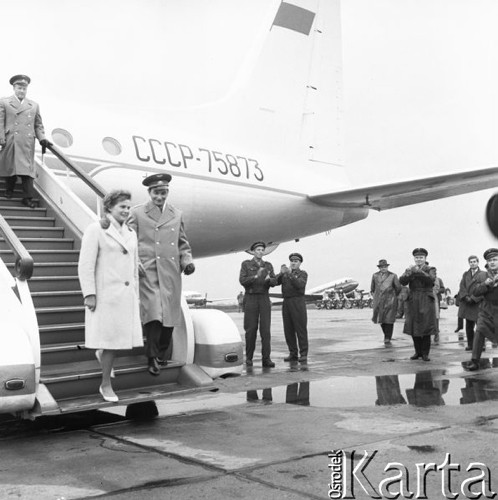 Radzieccy kosmonauci: Walentyna Tiereszkowa i Walery Bykowski, z wizytą w Polsce. Powitanie na lotnisku Okęcie.