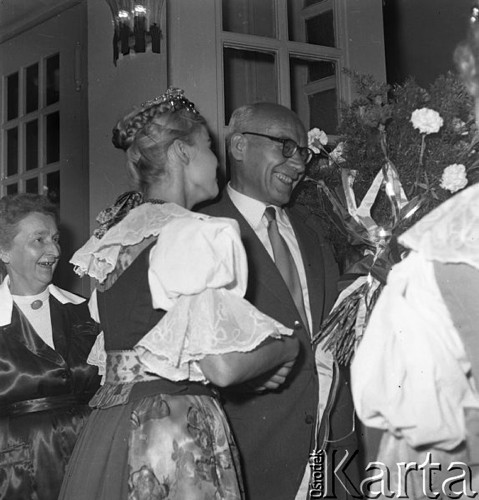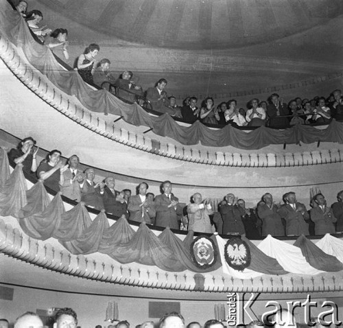 Obchody piętnastolecia PRL, przedstawiciele polskich i radzieckich władz oglądają występy Zespołu Pieśni i Tańca Śląsk. W dolnej loży stoją m.in.: Nikita Chruszczow, Władysław Gomułka i Edward Gierek.