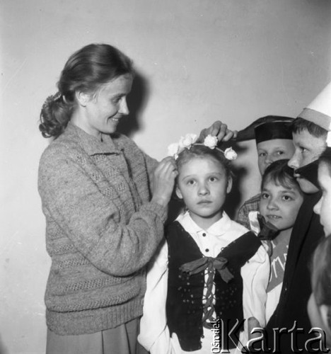 Nauczycielka i dzieci w ludowych strojach podczas przygotowań do przedstawienia.