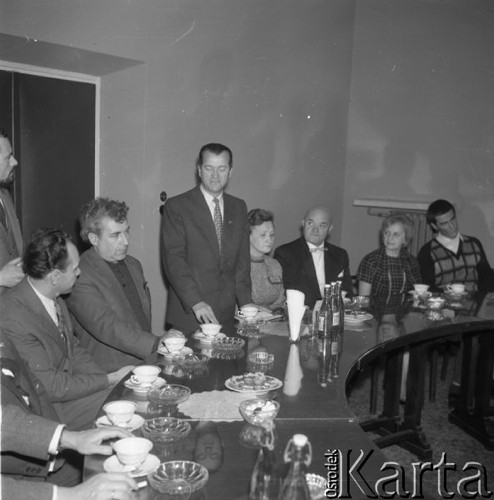 Siedziba Towarzystwa Przyjaźni Polsko-Radzieckiej - spotkanie polskich artystów z radzieckim dramaturgiem Aleksiejem Arbuzowem, z lewej stoi Adam Hanuszkiewicz.