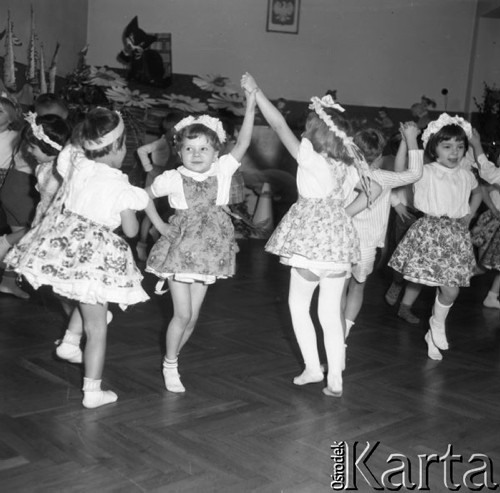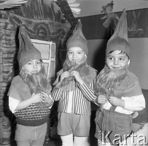 Dzieci podczas zabawy choinkowej w przedszkolu - trzej chłopcy przebrani za krasnale.