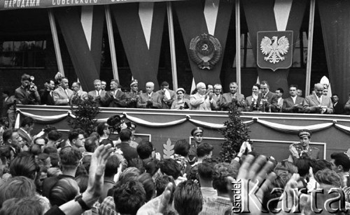Obchody piętnastolecia PRL, Nikita Chruszczow w czapce górniczej przemawia z trybuny, z lewej stoi Władysław Gomułka.