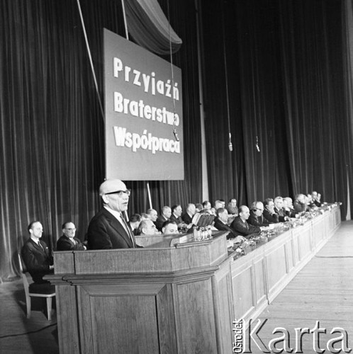 Wizyta radzieckich władz państwowych w 20. rocznicę zawarcia układu o przyjaźni między Polską a ZSRR, stoją od lewej: Aleksiej Kosygin, Władysław Gomułka, Andriej Gromyko i Leonid Breżniew.