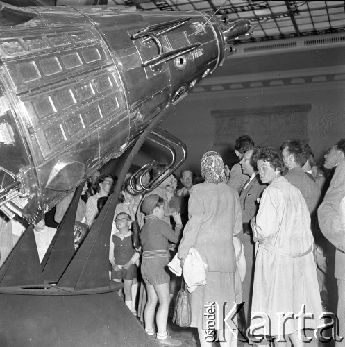 Pałac Kultury i Nauki, otwarcie wystawy prezentującej osiągnięcia radzieckiej kosmonautyki, mężczyzna przecinający wstęgę, w tle tłum oczekający na zwiedzanie.