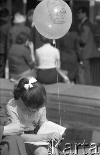 Kiermasz książki przed Pałacem Kultury i Nauki, na zdjęciu dziewczynka z balonikiem czyta książkę.