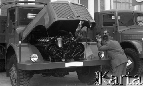 Targi Poznańskie, ekspozycja samochodów ciężarowych - mężczyźni zaglądają pod maskę ciężarówki.